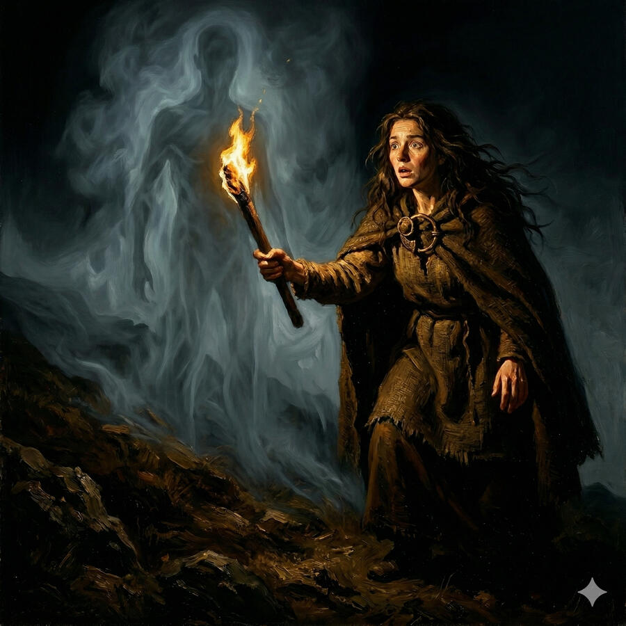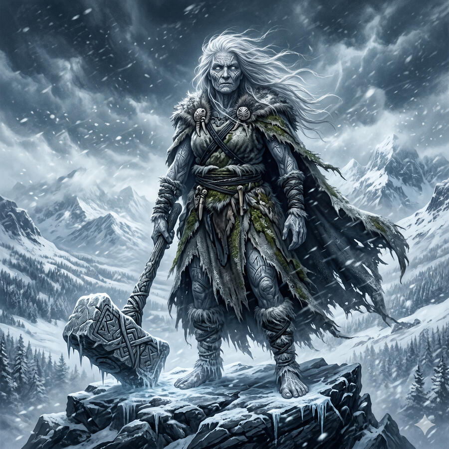 La Cailleach es la diosa del invierno, la tormenta y la tierra primordial tal y como existía antes de que la vida la suavizara. Se dice que tiene mil años y que ella misma talló las montañas a golpes de su gran martillo. Cuando camina, la escarcha brota bajo sus pies. Cuando sopla su aliento, llega el invierno. No es malévola — es la fuerza honesta del frío que hace necesario el calor, del silencio que hace valiosa la primavera. Sin ella, el mundo nunca conocería el descanso.