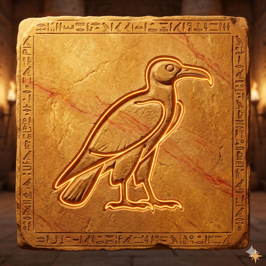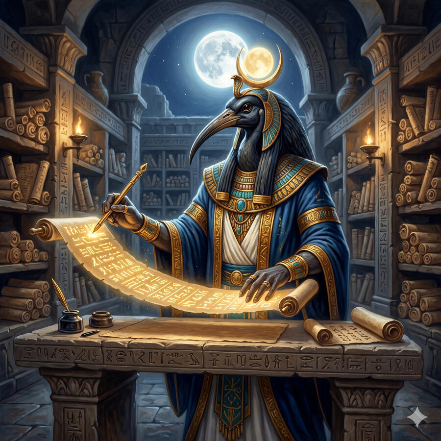 Thot es el dios de la escritura, la sabiduría, la luna y el tiempo. Con cabeza de ibis o en forma de babuino, fue él quien inventó los jeroglíficos y con ellos la posibilidad de transmitir conocimiento a través del tiempo. Es el escriba de los dioses, el que registra el resultado del juicio de los muertos en la Sala de las Dos Verdades. Cuando Horus perdió su ojo en la batalla contra Set, fue Thot quien lo restauró. Cuando Ra necesitaba consejo, era Thot quien lo daba. Es la inteligencia del universo tomando forma de pájaro sagrado.