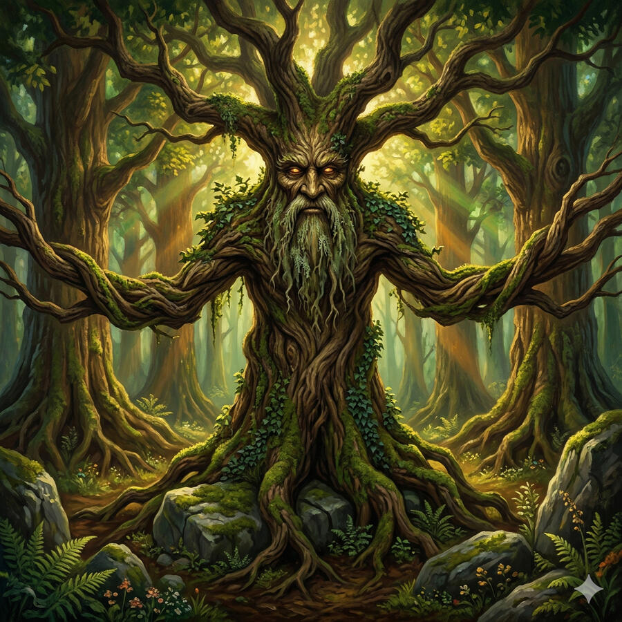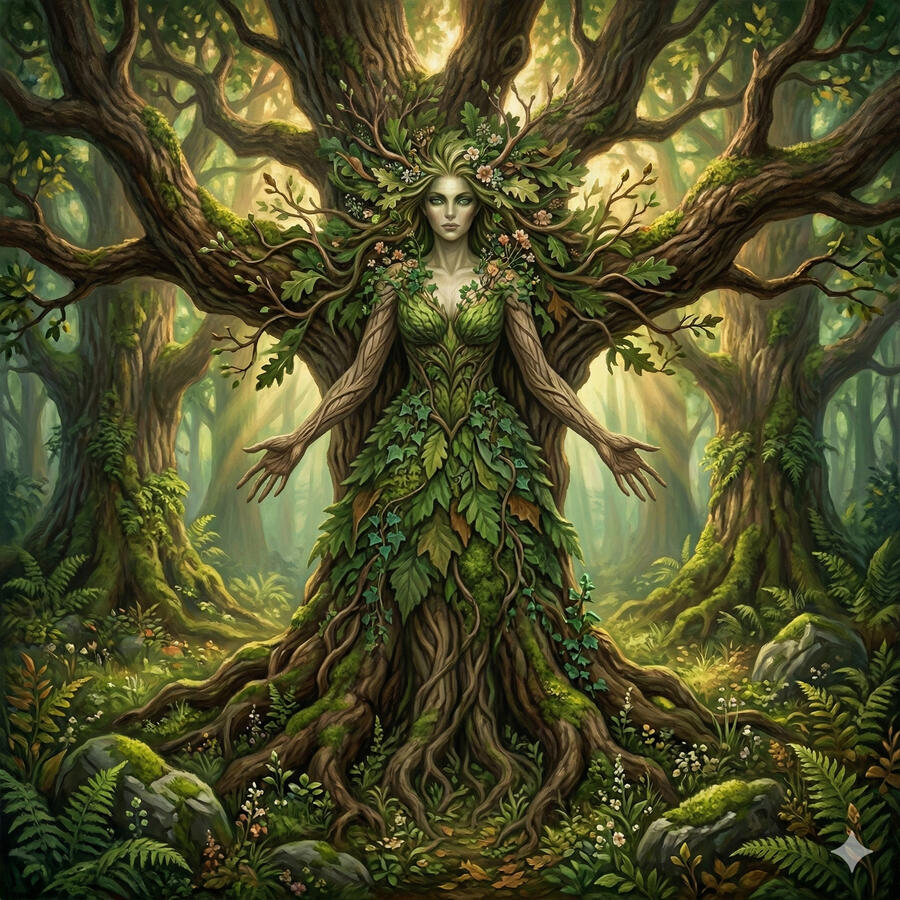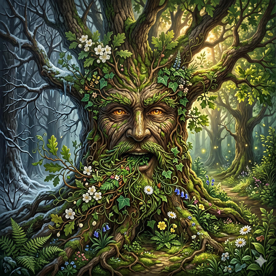 El Hombre Verde no tiene nombre en el sentido convencional porque es más arquetipo que dios — es la fuerza de la vegetación misma tomando forma de rostro entre las hojas. Aparece tallado en innumerables iglesias y templos celtas mirando desde la piedra con ramas y hojas brotando de su boca. Es el ciclo de la vida vegetal hecho consciencia: muere con las hojas de otoño y regresa indefectiblemente con los brotes de primavera. Es la promesa más antigua de todas — que la vida siempre vuelve.