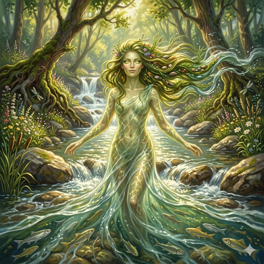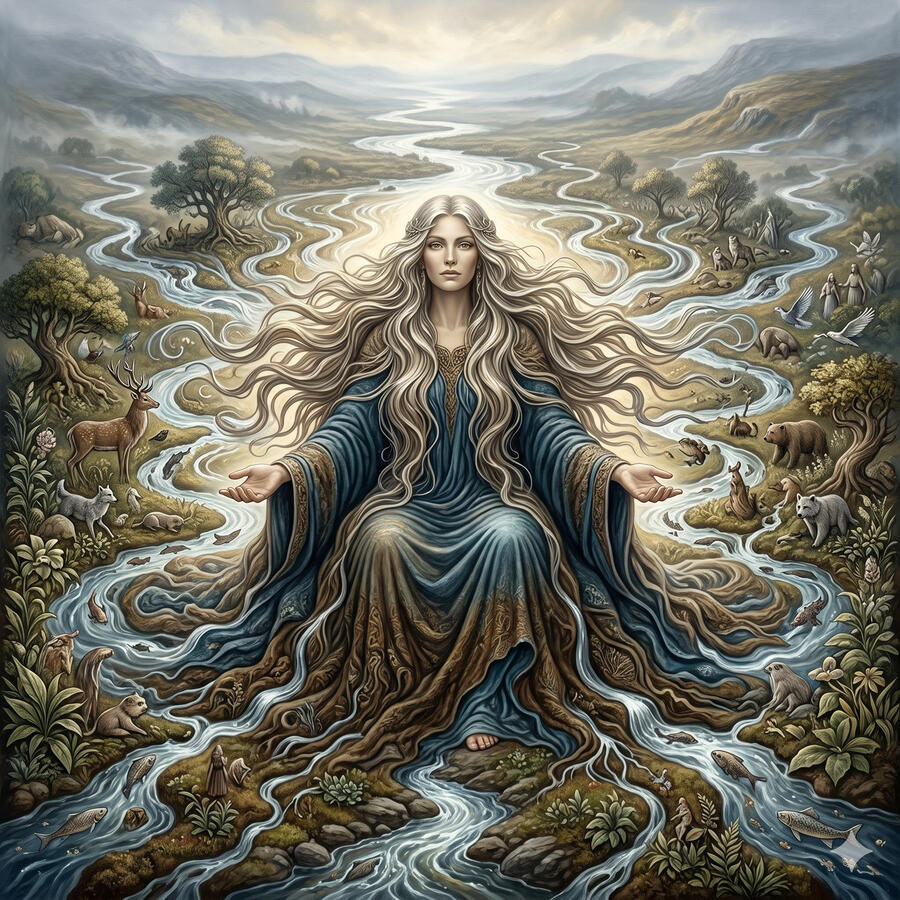 Danu es el misterio más profundo del panteón celta. Es la madre de los Tuatha Dé Danann — el pueblo de la diosa Danu — pero apenas aparece en los mitos porque no necesita actuar: ella es el origen. Es el río primordial, la corriente de conocimiento que fluye antes de que existieran las palabras para nombrarlo. Representa el principio femenino del universo, la fertilidad de la tierra y el conocimiento transmitido de generación en generación. Es el suelo del que nacen todos los demás dioses.