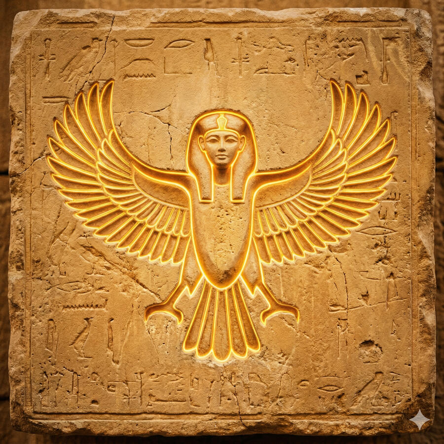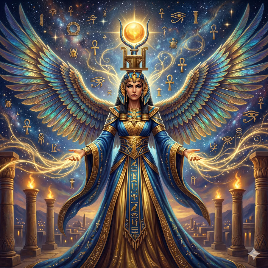 Isis es la diosa de la magia, la curación y la maternidad — y la más poderosa de todos los dioses egipcios en términos de habilidad mágica. Cuando Set asesinó a Osiris y dispersó sus partes por todo Egipto, fue Isis quien las buscó una por una, las reunió y devolvió la vida a su esposo el tiempo suficiente para concebir a Horus. Su nombre en egipcio significa trono. Sus alas protegen a los muertos, su leche nutre a los faraones, su magia puede torcer el destino. Es el amor como fuerza que desafía las leyes del universo.