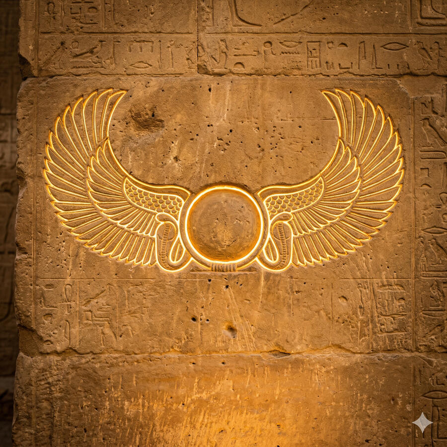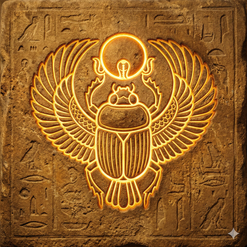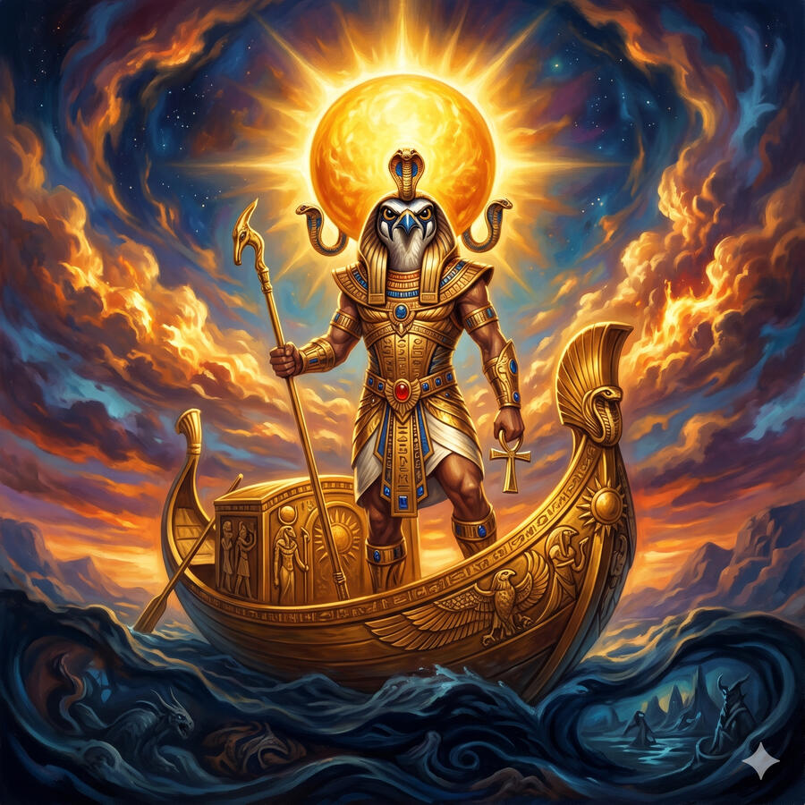Ra es el dios del sol y el creador supremo del universo egipcio. Cada día navega por el cielo en su barca solar llevando la luz al mundo, y cada noche desciende al inframundo donde debe enfrentarse a Apofis, la serpiente del caos, para poder renacer al amanecer. No es solo el sol — es el tiempo mismo, el ciclo que sostiene toda vida. Sin su viaje diario el mundo dejaría de existir. Los faraones se consideraban sus hijos directos porque gobernar Egipto era continuar la obra de Ra: mantener el orden frente al caos eterno.