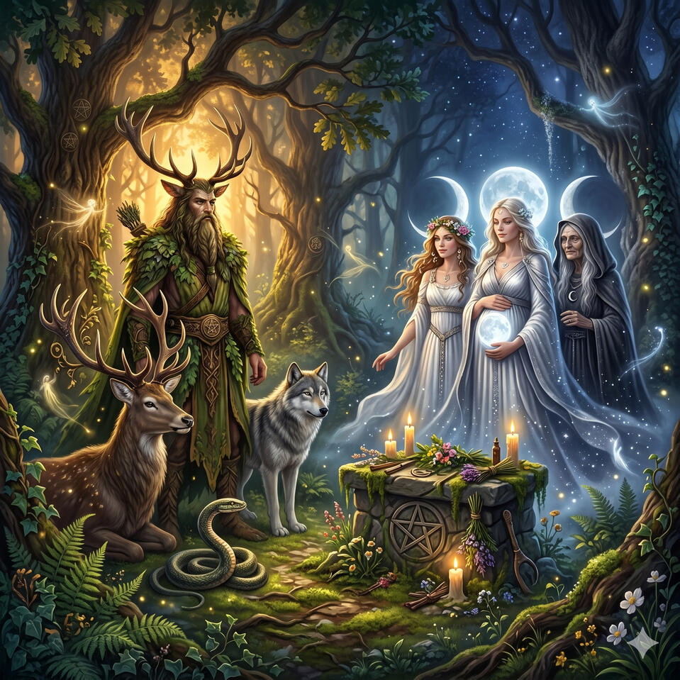La energía masculina divina de la wicca.Siempre representado con cuernos, consorte de la Diosa Triple y guardián de la naturaleza salvaje.Su nombre cambia según la tradición y la cultura — pero su esencia es siempre la misma: la fuerza primordial de lo masculino en conexión profunda con la tierra.