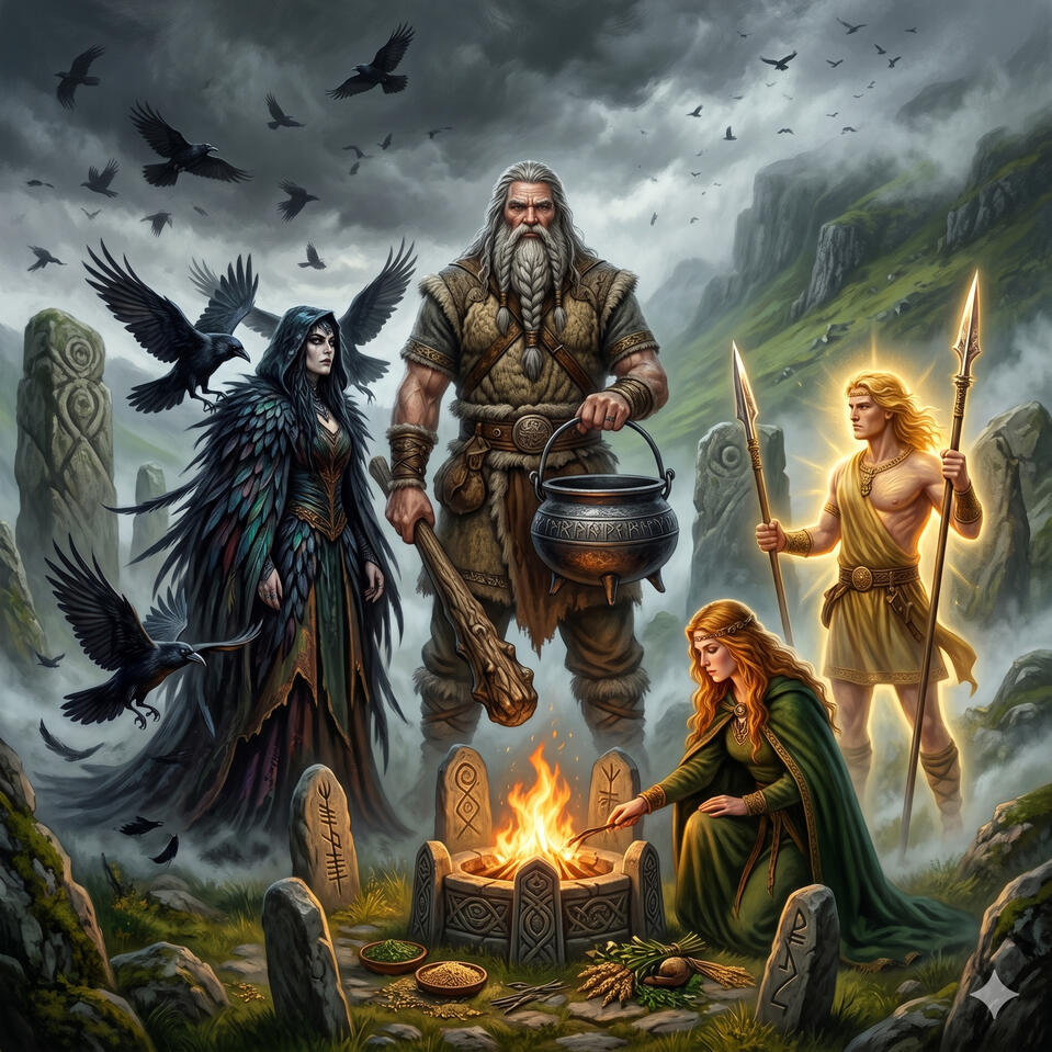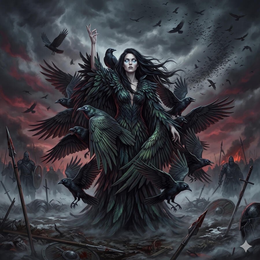 La Morrígan no lucha en los campos de batalla — los observa desde arriba con ojos de cuervo y decide el destino de cada guerrero antes de que caiga la primera espada. Es una diosa triple que puede aparecer como joven seductora, mujer madura de poder imparable o anciana que lava la ropa ensangrentada de los que van a morir. Los cuervos son sus mensajeros y sus ojos. No es el mal — es la inevitabilidad. Representa la profecía, la soberanía de la tierra y la transformación que solo viene a través de la pérdida.