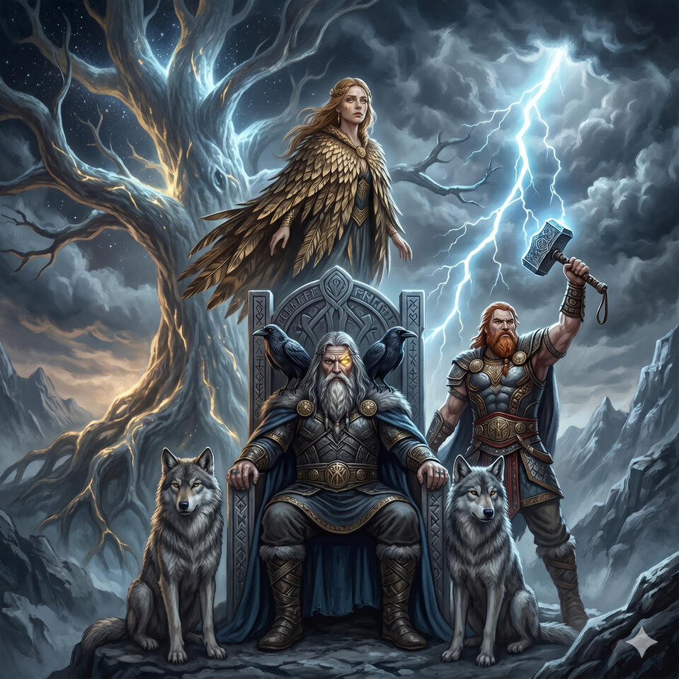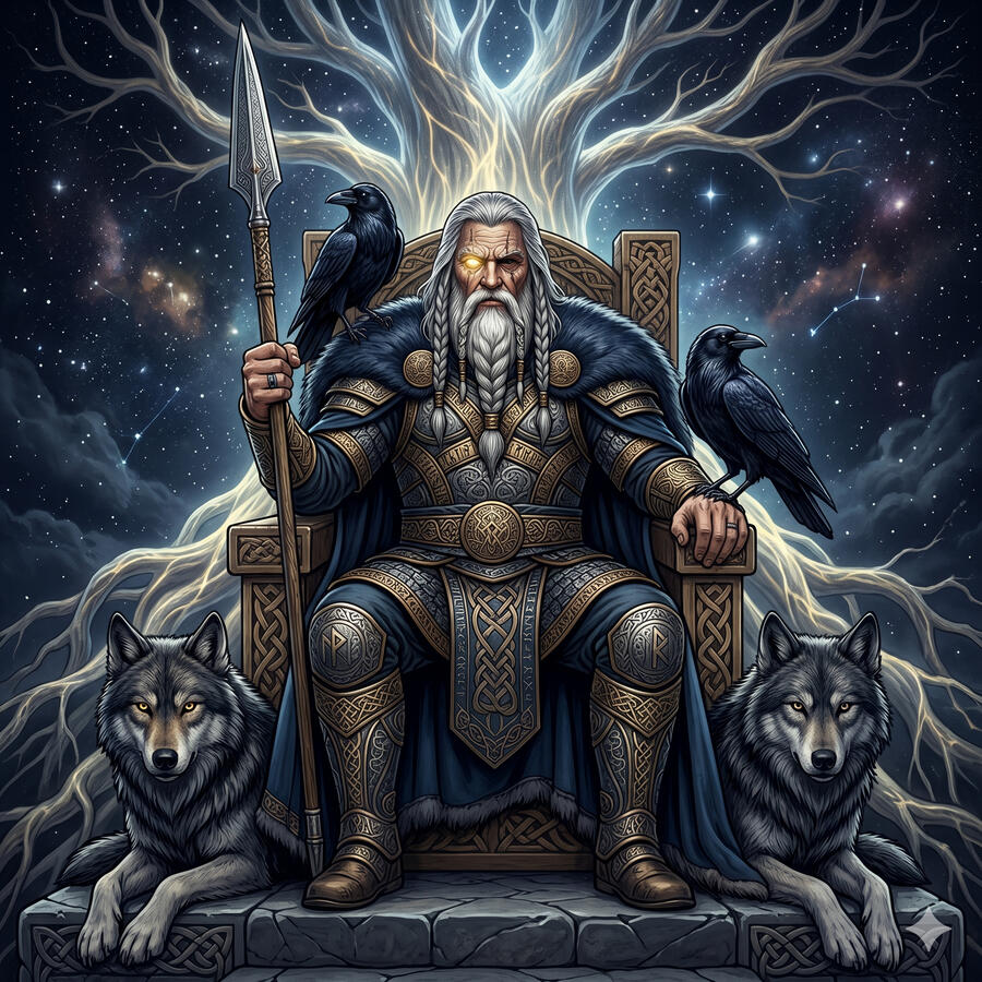 Odín no nació siendo sabio — lo eligió. Se colgó del Yggdrasil durante nueve días sin comer ni beber, se atravesó con su propia lanza y se arrancó un ojo para beberlo en el pozo de Mimir. Todo por el conocimiento de las runas. Es el dios de la sabiduría, la guerra, la muerte, la poesía y la magia. No es un padre bondadoso — es un dios que usa a los hombres como piezas en un tablero cuyo final solo él conoce. Sus dos cuervos Huginn y Muninn recorren los nueve mundos cada día y le susurran todo lo que ven al oído.