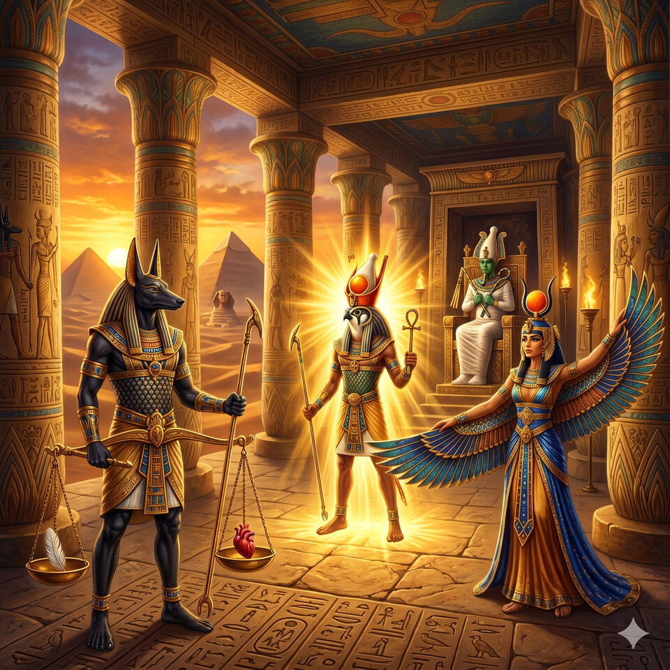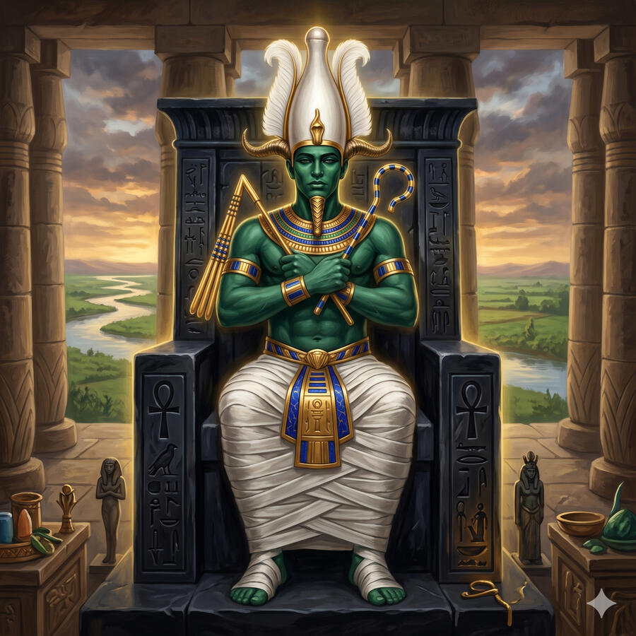 Osiris es el dios de la muerte, la resurrección y la fertilidad — el primer rey de Egipto que murió y resucitó. Su hermano Set lo asesinó, desmembró su cuerpo y dispersó los pedazos por todo el mundo. Isis los reunió y le devolvió la vida lo suficiente para concebir a Horus. Osiris no regresó al mundo de los vivos — se convirtió en rey del mundo de los muertos, el juez supremo del Duat. Su historia es la más poderosa del panteón egipcio: la prueba de que incluso la muerte puede ser vencida con amor suficiente y que el orden siempre regresa después del caos.