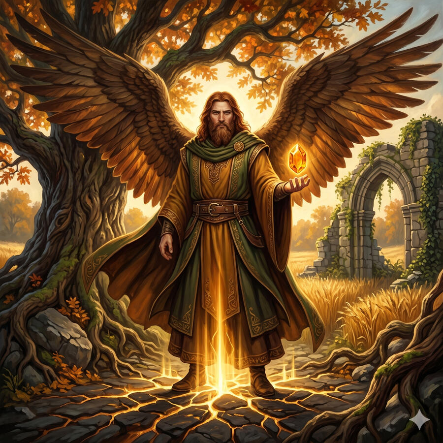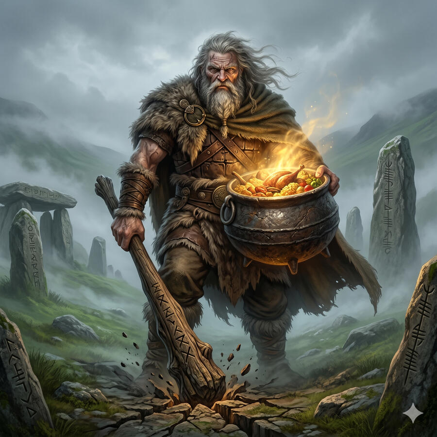 El Dagda es el dios supremo del panteón celta, padre de los dioses y señor de la vida y la muerte. Posee dos tesoros que definen su naturaleza dual: un gran garrote capaz de matar a los vivos con un extremo y resucitar a los muertos con el otro, y un caldero mágico del que nunca deja de brotar alimento. No es un dios bello ni refinado — es enorme, tosco y poderoso como la tierra misma. Controla las estaciones con su arpa, y cuando la toca, el mundo obedece. Es el dios de la abundancia, del conocimiento druídico y de la fuerza bruta al servicio de su pueblo.