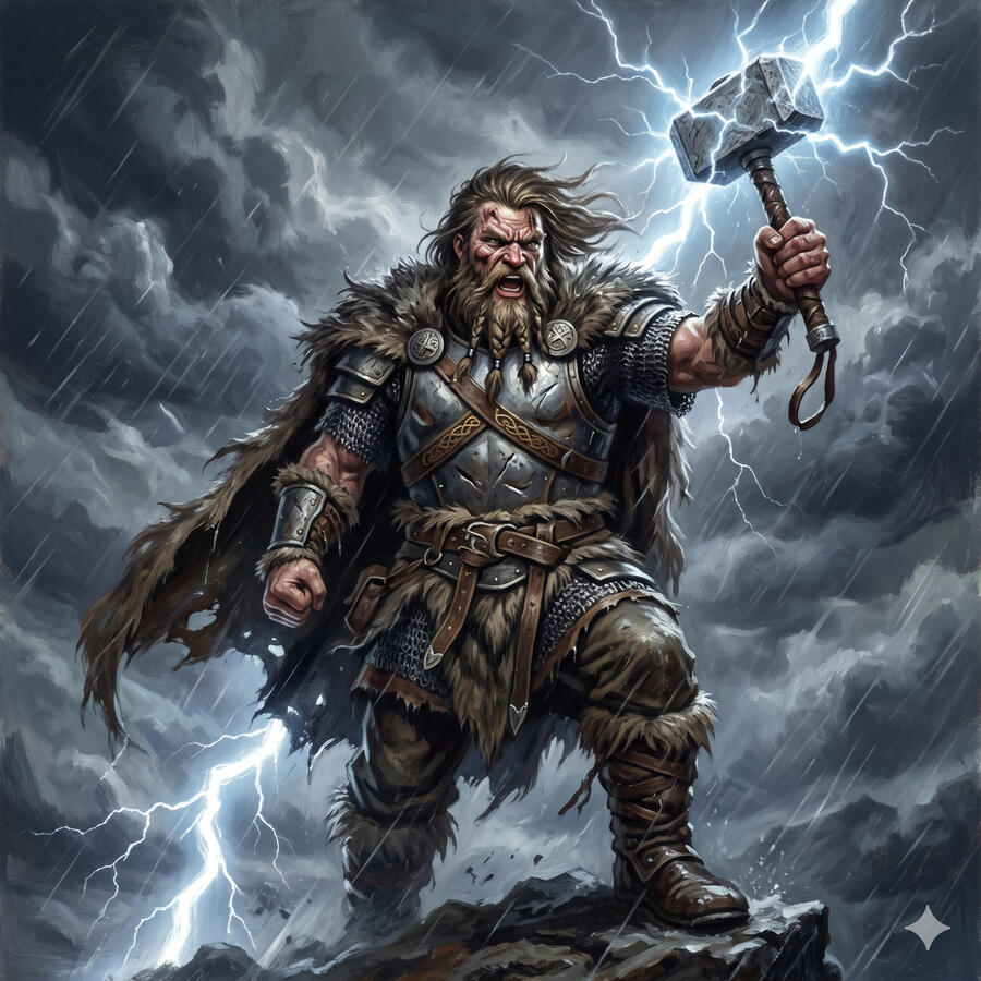 Thor es el hijo de Odín y el dios más venerado por el pueblo nórdico común. No es solo el dios del trueno — es el protector de la humanidad, el que mantiene alejados a los gigantes de hielo que quieren destruir Midgard. Su martillo Mjolnir no es solo un arma: es el símbolo del orden frente al caos, del hogar protegido frente a la tormenta. Enorme, pelirrojo, impulsivo y absolutamente leal, Thor es la fuerza de la naturaleza puesta al servicio de los más débiles.