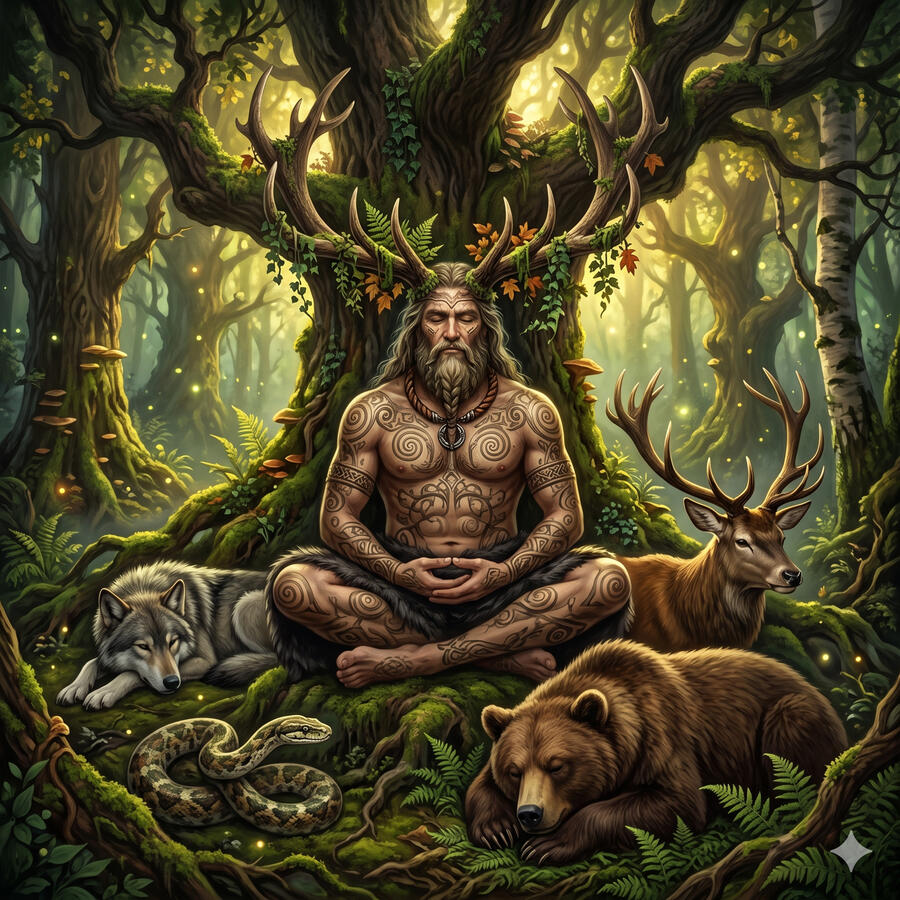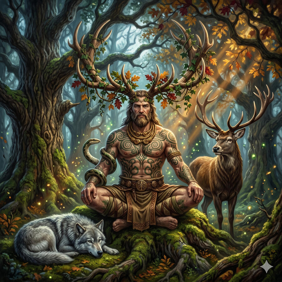 Cernunnos es el dios más antiguo y misterioso del panteón celta — tan viejo que casi no quedan textos sobre él, solo imágenes talladas en piedra donde aparece sentado en posición de meditación con cornamenta de ciervo, rodeado de animales salvajes que acuden a él en paz. Es el señor de la naturaleza indómita, de los ciclos de vida y muerte, de la abundancia del bosque y del paso entre los mundos. No pertenece del todo al mundo de los vivos ni al de los muertos. Es el umbral mismo.