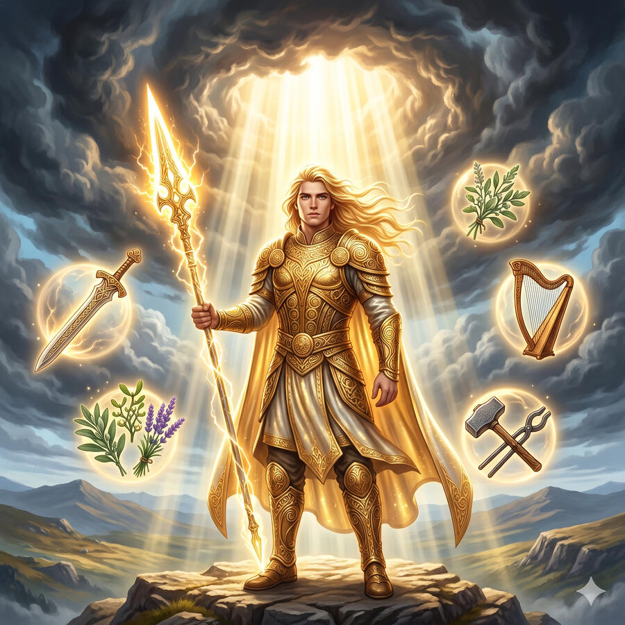 Lugh es el dios solar celta, pero su grandeza no radica solo en la luz — sino en que domina absolutamente toda disciplina que existe. Herrero, guerrero, poeta, sanador, mago, artesano: ningún arte le es ajeno. Cuando llegó a la corte de los Tuatha Dé Danann le preguntaron qué sabía hacer, y respondió que lo sabía todo. Su lanza Areadbhar nunca falla y su honda lanzó la piedra que mató al gigante Balor. Es juventud, destreza y la promesa de que la maestría tiene recompensa.