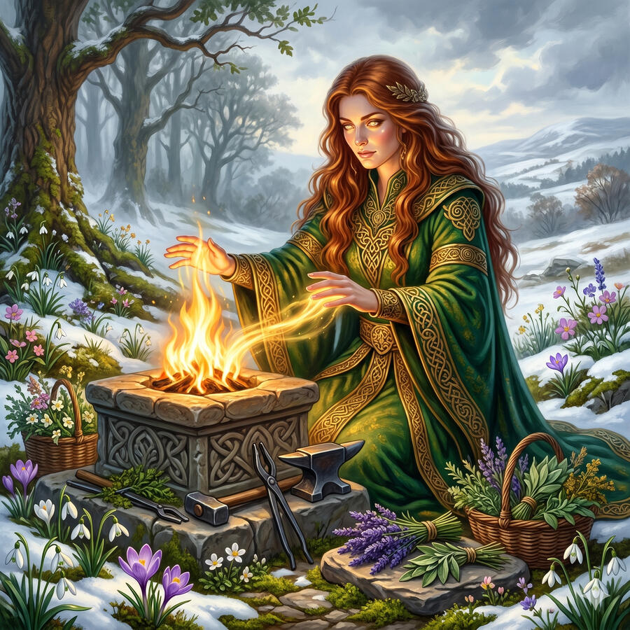 Brigid es quizás la diosa celta más amada, aquella cuyo culto sobrevivió incluso la llegada del cristianismo transformándose en Santa Brígida. Rige tres fuegos sagrados: el fuego del hogar que da calor y alimento, el fuego de la fragua que transforma el metal en herramienta y el fuego de la inspiración que convierte las palabras en poesía. Es sanadora de heridas del cuerpo y del alma. Su festival Imbolc marca el primer aliento de la primavera. Donde Brigid posa sus manos, las cosas florecen.