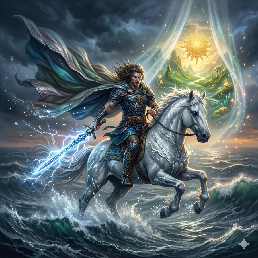 Manannán Mac Lir es el dios del mar y el principal guardián del Tír na nÓg, la tierra de la eterna juventud más allá del océano occidental. Cabalga sobre las olas en su carro como si fueran campos de batalla, su capa puede cambiar de color como el mar cambia de humor y su espada Fragarach corta cualquier armadura y extrae la verdad de quien toca su filo. Es el gran mago y el gran ilusionista — aquel que puede hacer que el mundo visible desaparezca y revelar el que se esconde detrás.