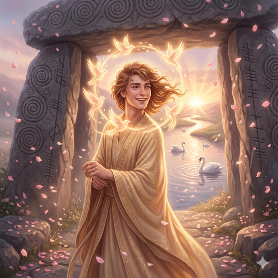 Aengus Óg es el dios del amor, la juventud y la poesía en la tradición irlandesa. Vive en Brú na Bóinne — el gran túmulo megalítico del solsticio — y se dice que cuando duerme, sus sueños toman forma de pájaros que vuelan por el mundo llevando el amor de un corazón a otro. Su propia historia de amor con Caer Ibormeith, a quien buscó incansablemente transformándose en cisne para estar junto a ella, es uno de los relatos más hermosos de toda la mitología celta.