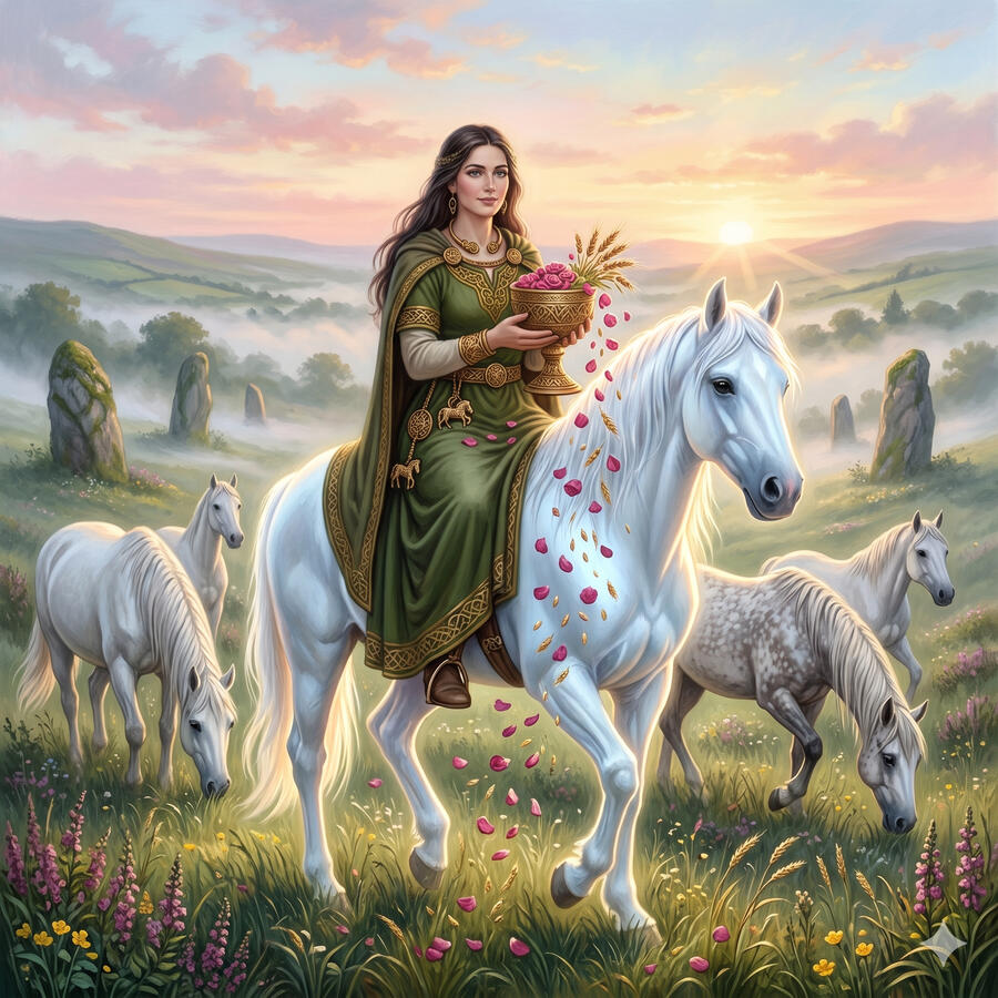 Epona es la diosa de los caballos, de la fertilidad y del viaje entre el mundo de los vivos y el de los muertos. Su figura es tan poderosa que traspasó las fronteras del mundo celta y fue adoptada y venerada por las legiones romanas en toda Europa. Aparece siempre sobre un gran caballo blanco o rodeada de ellos, con una copa de abundancia en las manos. El caballo para los celtas no era solo un animal — era el vehículo del alma entre mundos, y Epona era su guardiana.
