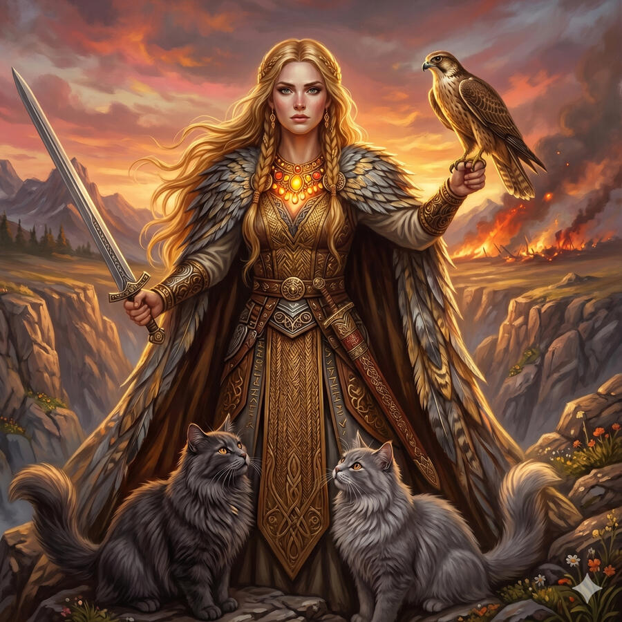 Freya es la diosa del amor, la belleza, la fertilidad y la guerra. Antes de que las valquirias llevaran a los guerreros caídos al Valhalla, Freya elegía la mitad para llevarlos a su propio salón, Fólkvangr. Viaja en un carro tirado por gatos, lleva el collar Brísingamen forjado por enanos y puede transformarse en halcón. Llora lágrimas de oro cuando echa de menos a su esposo desaparecido. Es deseo y pérdida, victoria y duelo — la prueba de que las fuerzas más grandes nunca vienen solas.
