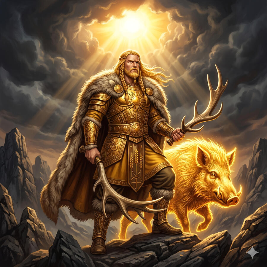 Freyr es el dios del sol, la lluvia, la fertilidad y la prosperidad. Cuando está contento, las cosechas crecen y el mundo es fértil. Gobierna Alfheim, el reino de los elfos de luz. Pero Freyr cometió el acto más impulsivo de la mitología nórdica: dio su espada encantada — la que luchaba sola — al guardián de su amada Gerðr como precio por casarse con ella. Sin su espada, en el Ragnarök luchará con un asta de ciervo y caerá ante el gigante de fuego Surtr. El amor que te hace poderoso y el amor que te desarma son el mismo amor.