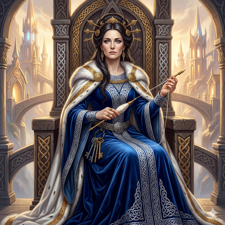 Frigg es la esposa de Odín y la reina de Asgard. Comparte con él el trono Hlidskjalf desde el que pueden ver todos los mundos, y se dice que conoce el destino de todos los seres — pero nunca lo revela. Es la diosa del matrimonio, la maternidad y la sabiduría doméstica, pero su silencio esconde una profundidad que pocos comprenden. Cuando su hijo Baldr soñó con su propia muerte, fue ella quien recorrió el mundo entero pidiendo a cada ser que prometiera no hacerle daño. Solo olvidó el muérdago.