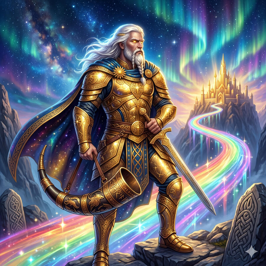 Heimdall necesita menos sueño que un pájaro y puede oír crecer la hierba y la lana en las ovejas. Vigila el puente Bifrost — el arcoíris que une Asgard con los demás mundos — y cuando el Ragnarök llegue, será él quien toque el cuerno Gjallarhorn para despertar a todos los dioses. Es la conciencia perpetua, la vigilancia sin descanso, el ojo que nunca se cierra. Se dice que es el padre de la humanidad, que viajó entre los hombres dándoles las tres clases sociales. La primera alarma del apocalipsis dormita en sus labios.