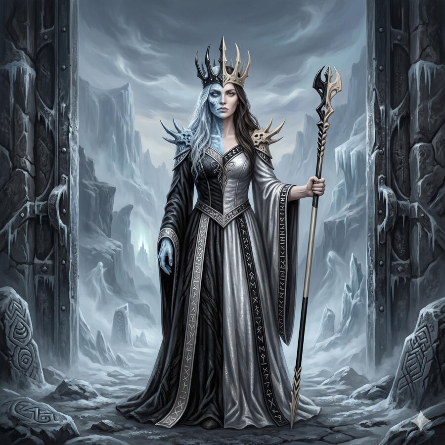 Hija de Loki y la giganta Angrboda, Hel gobierna Niflheim — el reino de los muertos que no cayeron en combate. Su cuerpo está dividido en dos: la mitad viva, la mitad cadáver. No eligió su rol — se lo asignaron los dioses que temían su naturaleza. Pero gobierna su reino con absoluta justicia y ecuanimidad. No es cruel: simplemente es inevitable. Todos los que no mueren como guerreros — ancianos, enfermos, los que mueren en paz — terminan en su reino. Es la más democrática de los dioses: a todos los recibe por igual.