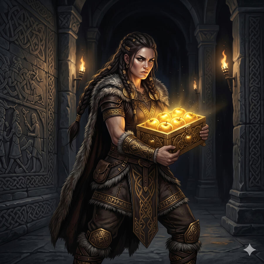 Idun es quizás la más indispensable de todos los dioses, aunque sea la menos guerrera. Guarda las manzanas doradas de la juventud eterna — y sin ellas, los dioses envejecerían y morirían como cualquier mortal. Cuando Loki la entregó al gigante Þjazi, los dioses comenzaron a envejecer visiblemente en días. El pánico fue total. Loki tuvo que rescatarla transformándose en halcón, y cuando Idun regresó con su cesta, la juventud volvió a Asgard de golpe. Es la evidencia de que la vida no se sostiene en la fuerza sino en lo que la nutre.