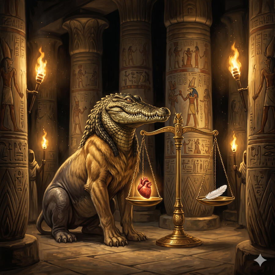 Ammit no es un dios — es la consecuencia. Mitad leona, mitad hipopótamo, mitad cocodrilo, espera junto a la balanza de Maat en la Sala de las Dos Verdades. Si el corazón de un muerto pesa más que la pluma de la verdad, ella lo devora — y esa alma desaparece para siempre. No hay infierno después, no hay segunda oportunidad. Solo el olvido absoluto. Por eso los egipcios no temían tanto a la muerte como a la indignidad. Ammit ejecuta la justicia del universo con una precisión que ningún dios puede discutir.