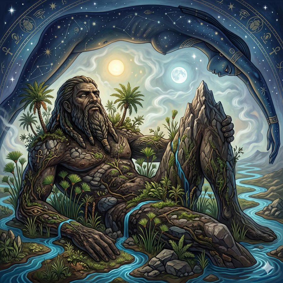 Geb es el dios de la tierra — no el dios que controla la tierra sino el dios que es la tierra. Su cuerpo es el suelo de Egipto, sus carcajadas son los terremotos y las plantas crecen directamente de su espalda. Es el padre de Osiris, Isis, Set y Neftis. Junto a su esposa Nut, la diosa del cielo, formaban la pareja primordial que abrazaba toda la existencia: ella arqueada sobre él como el firmamento, él extendido bajo ella como el mundo. Cuando Geb y Nut fueron separados por Shu el dios del aire, nació el espacio donde existe la vida.