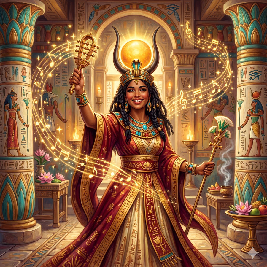 Hathor es la diosa del amor, la belleza, la música, la danza y la alegría — pero también de la embriaguez ritual y la destrucción cuando se convierte en Sekhmet. Es la madre divina por excelencia, representada como vaca sagrada o mujer con cuernos de vaca sosteniendo el disco solar. Los sacerdotes tocaban el sistrum en su honor para que su alegría inundara el templo. Cuando Ra envió a Sekhmet a destruir a la humanidad, fueron los sacerdotes de Hathor quienes tiñeron la cerveza de rojo para engañarla y detener la masacre. Incluso la destrucción puede detenerse con alegría.