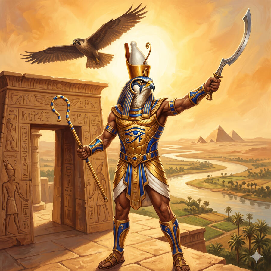 Horus es el dios halcón, hijo de Osiris e Isis, y el dios del cielo y la realeza. Cuando Set asesinó a Osiris y usurpó el trono de Egipto, fue Horus quien luchó durante décadas para recuperarlo. En la batalla perdió su ojo izquierdo, que fue restaurado por Thot convirtiéndose en el Ojo de Horus — el símbolo de protección más poderoso del antiguo Egipto. Cada faraón vivo era considerado la encarnación de Horus. Sus dos ojos son el sol y la luna. Cuando vuela sobre el mundo, sus alas son el cielo mismo.