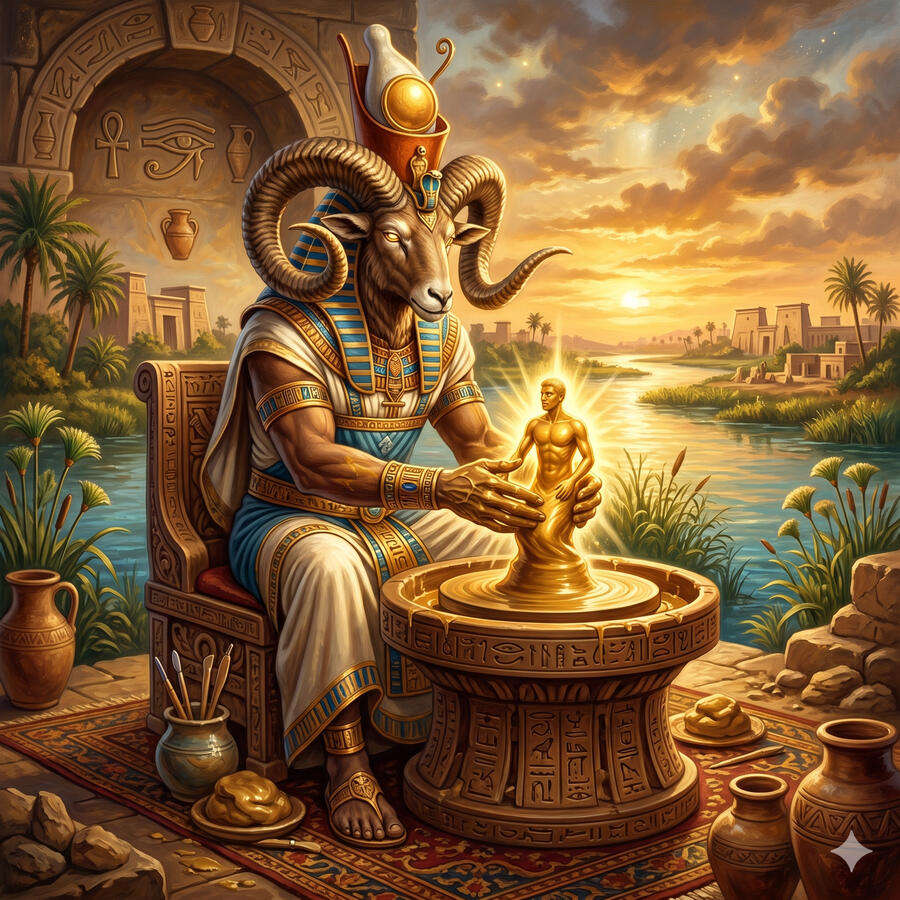 Jnum es el dios carnero de las cataratas del Nilo y el creador de los seres humanos. Según los textos egipcios, fue él quien modeló a cada persona en su rueda de alfarero — no solo el cuerpo sino también el ka, la fuerza vital que lo anima. Controla las inundaciones anuales del Nilo que fertilizaban los campos de Egipto, siendo así el responsable de la abundancia. Es el dios más íntimamente ligado a la creación individual: mientras Ra creó el mundo, Jnum creó a cada ser humano uno por uno con sus propias manos.