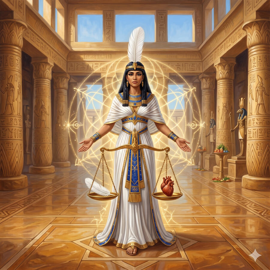 Maat no es solo una diosa — es el principio fundamental sobre el que se sostiene toda la civilización egipcia. Es la verdad, la justicia, el orden cósmico y el equilibrio universal. Se representa como mujer con una pluma de avestruz en la cabeza — la misma pluma contra la que se pesa el corazón de los muertos. Sin Maat el sol no saldría, el Nilo no inundaría, las cosechas no crecerían. Los faraones gobernaban en su nombre porque gobernar era mantener el orden que ella encarna. Es la ley más antigua — anterior a los dioses mismos.