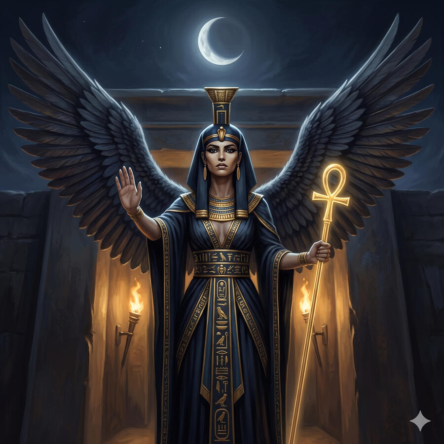 Neftis es la hermana de Isis y Osiris, esposa de Set y madre de Anubis. Habita en los márgenes — entre la vida y la muerte, entre el orden y el caos, entre la luz y la sombra. Cuando Set mató a Osiris fue Neftis quien ayudó a Isis a buscar sus partes, traicionando a su propio esposo por lealtad a su familia. Protege a los muertos junto a Anubis, custodia los vasos canopos que guardan los órganos y guía a las almas en el Duat. Es la diosa de lo que está en los bordes, de lo que nadie ve pero sin lo cual nada funciona.