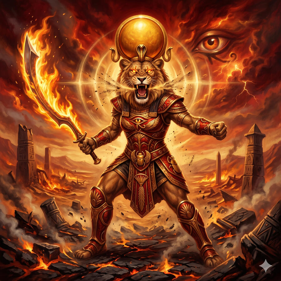 Sekhmet es la diosa leona de la guerra, las enfermedades y la destrucción — pero también de la curación, porque quien puede causar la enfermedad puede también curarla. Cuando Ra se cansó de la desobediencia humana la envió a castigarlos, pero Sekhmet entró en un frenesí de destrucción que amenazaba con exterminar a toda la humanidad. Los dioses tuvieron que teñir miles de jarras de cerveza con sangre de granadas y embriagarla para que se detuviera. Es la fuerza que no puede controlarse una vez desatada — el recordatorio de que el poder sin límites destruye incluso lo que ama.