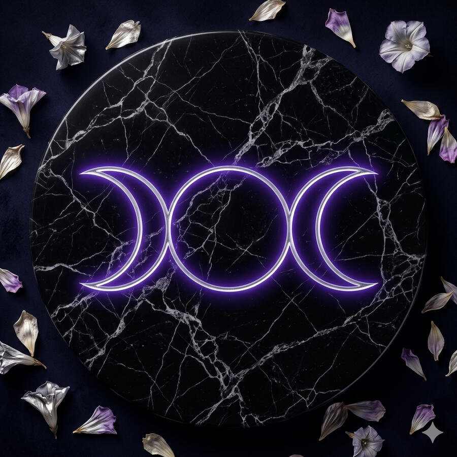 Muestra cómo cambia la luna y, con ella, las etapas de la mujer. La Luna Creciente es la Doncella (juventud, sueños y comienzos). La Luna Llena es la Madre (madurez, creación y fuerza). La Luna Menguante es la Anciana (sabiduría, finales y paz). Nos recuerda que cambiar y envejecer es algo sagrado y natural.